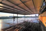 With a simple, wireless remote control, here the En-Fold is deployed across the terrace and is tensioned using a patent-pending belt drive system. Strong architectural fabric panels shield the area below from inclement weather or harsh sunlight. The En-Fold® system can withstand 50 mile per hour winds when fully tensioned, and is installed at a slight incline to shed rainwater and prevent water from pooling on the fabric panels.