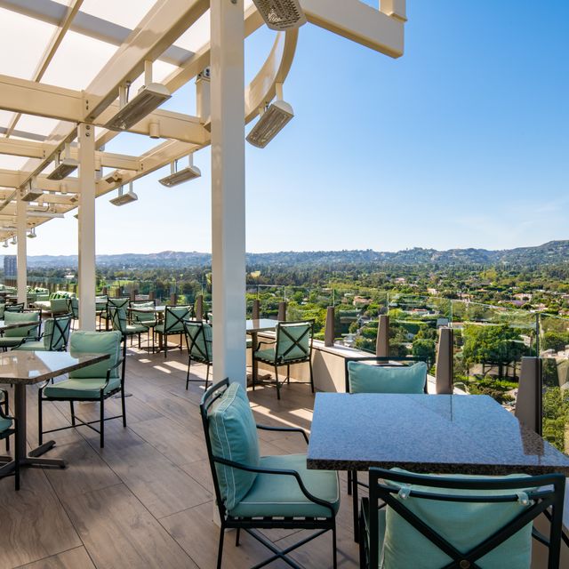 The Waldorf Astoria Beverly Hills hotel features an al fresco bar/café called The Rooftop by JG. Perched 12 stories above the intersection of Wilshire and Santa Monica Boulevards, the restaurant serves up luxurious views of the L.A. skyline and Hollywood Hills, in addition to delicious cuisine. Previously existing floor-mounted umbrellas offered only scattered sun shade and were time-consuming to individually open and close, while their stanchions impeded foot traffic and obstructed the panoramic sightlines. The hotel owners wanted a single retractable awning solution that would not only protect nearly the entire seating area from sun and rain, but do so with minimal impact on views—all at the touch of a button.